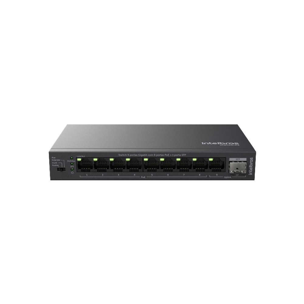 » 8 portas Gigabit Ethernet PoE e 2 portas Uplink, sendo uma porta Gigabit e uma SFP.